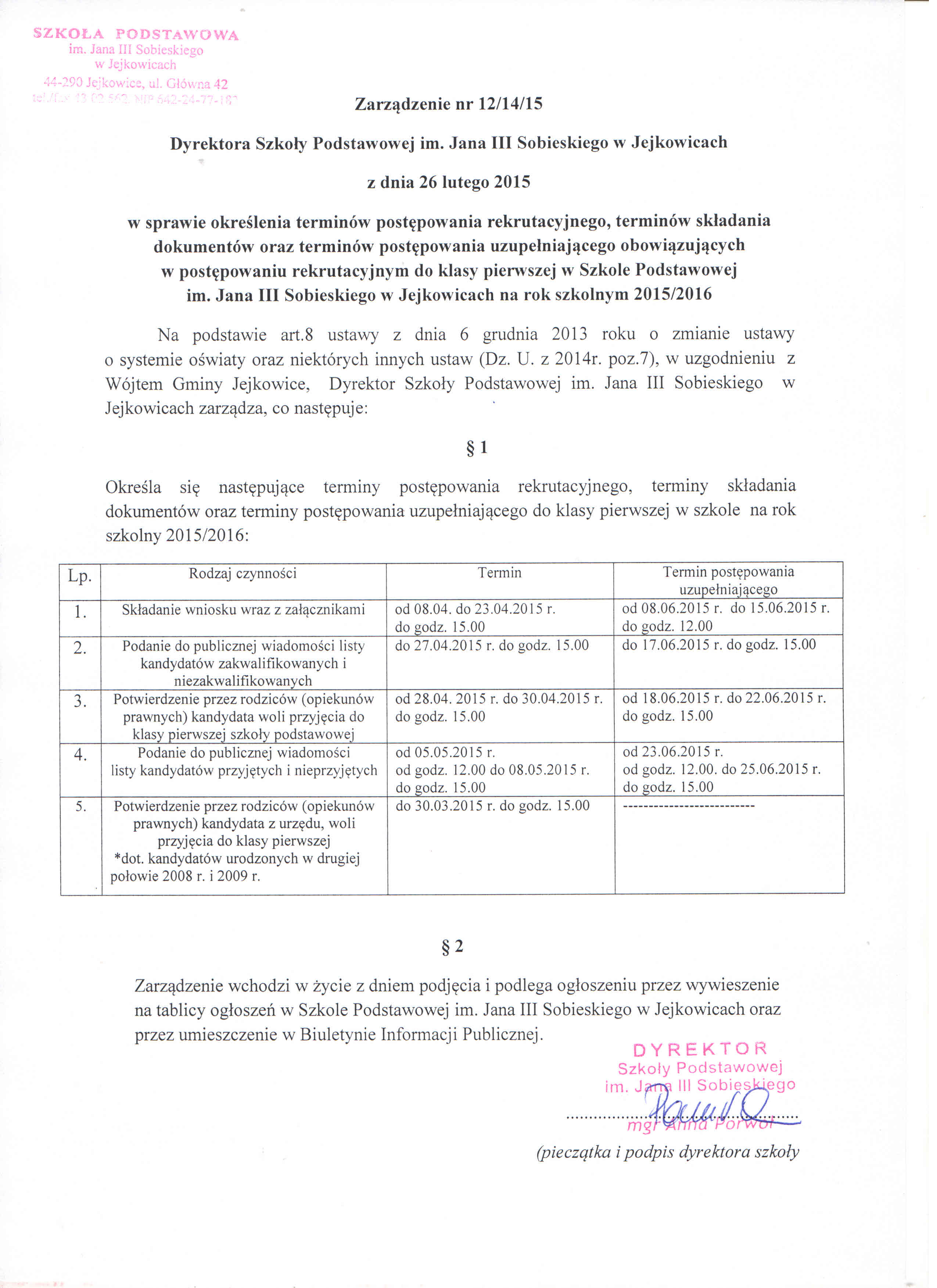 Zarządzenie nr 12/14/15 Dyrektora Szkoły Podstawowej w Jejkowicach - dot. terminów rekrutacji do klasy pierwszej.