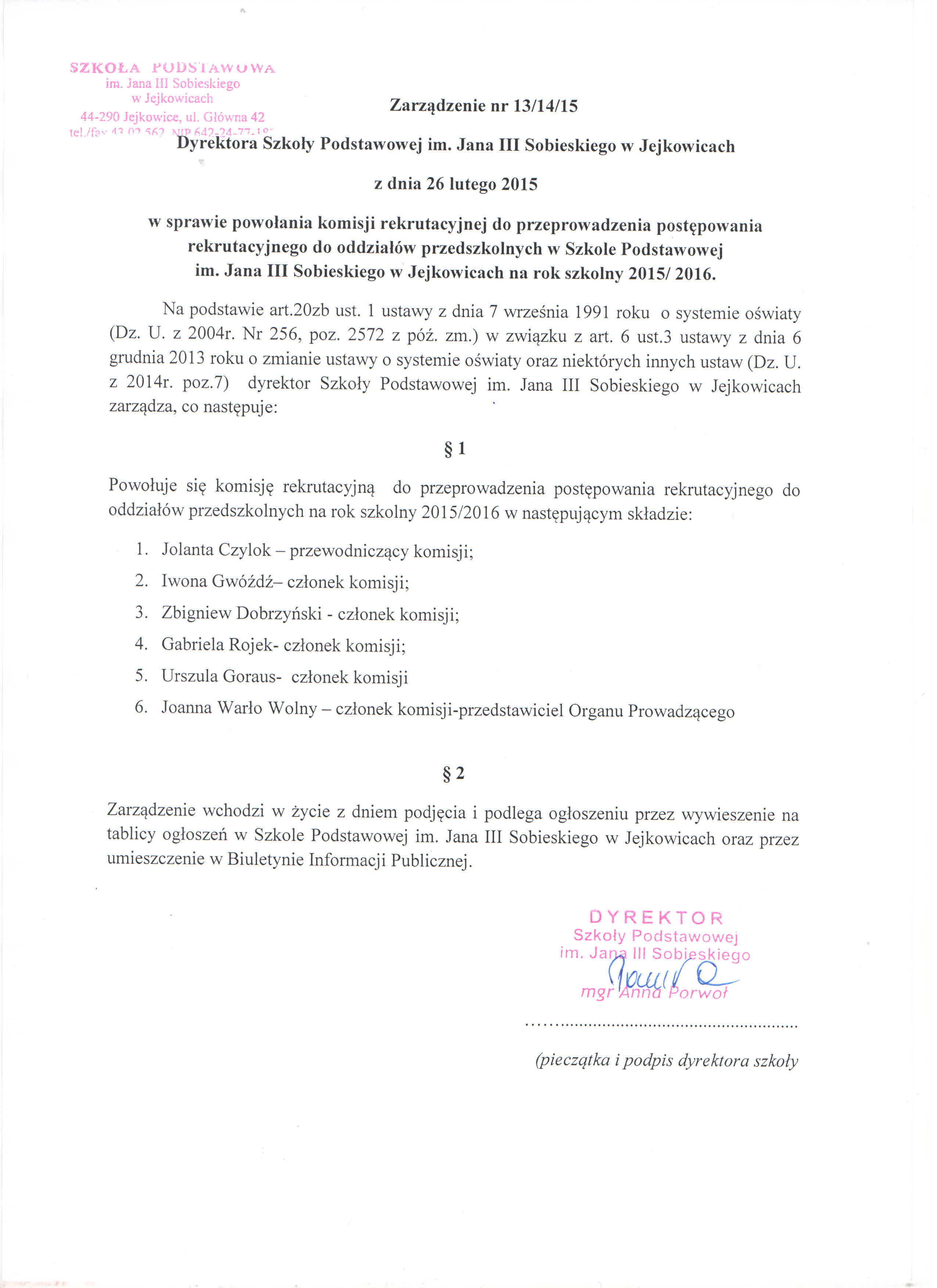 Zarządzenie nr 13/14/15 Dyrektora Szkoły Podstawowej w Jejkowicach - dot. powołania komisji rekrutacyjnej do oddziałów przedszkolnych.