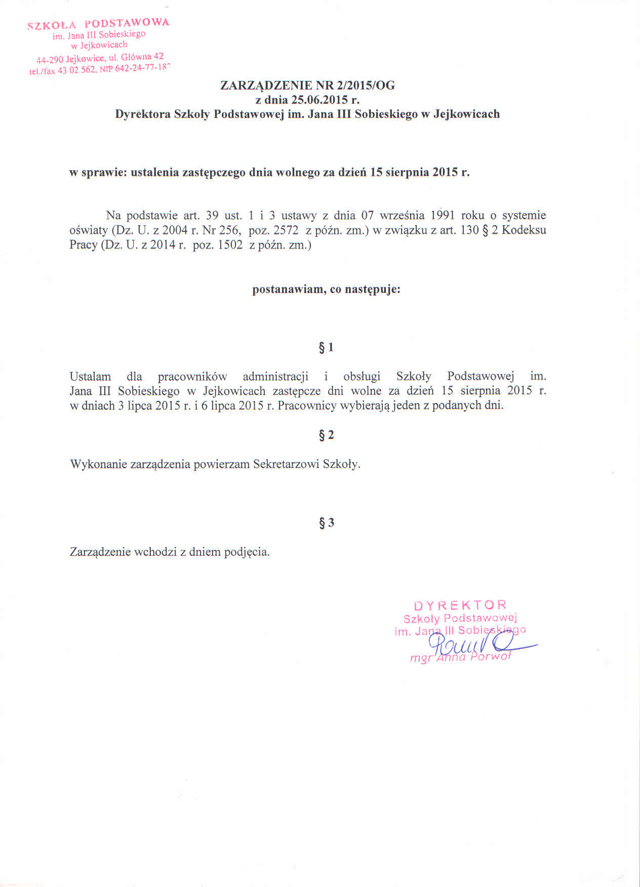 Agnieszka Zurek) - Dodanie załącznika [zarzadzenie_dyrektora_szkoly_z_dnia_25062015r.jpg] do dokumentu. (Dokument opublikowany)